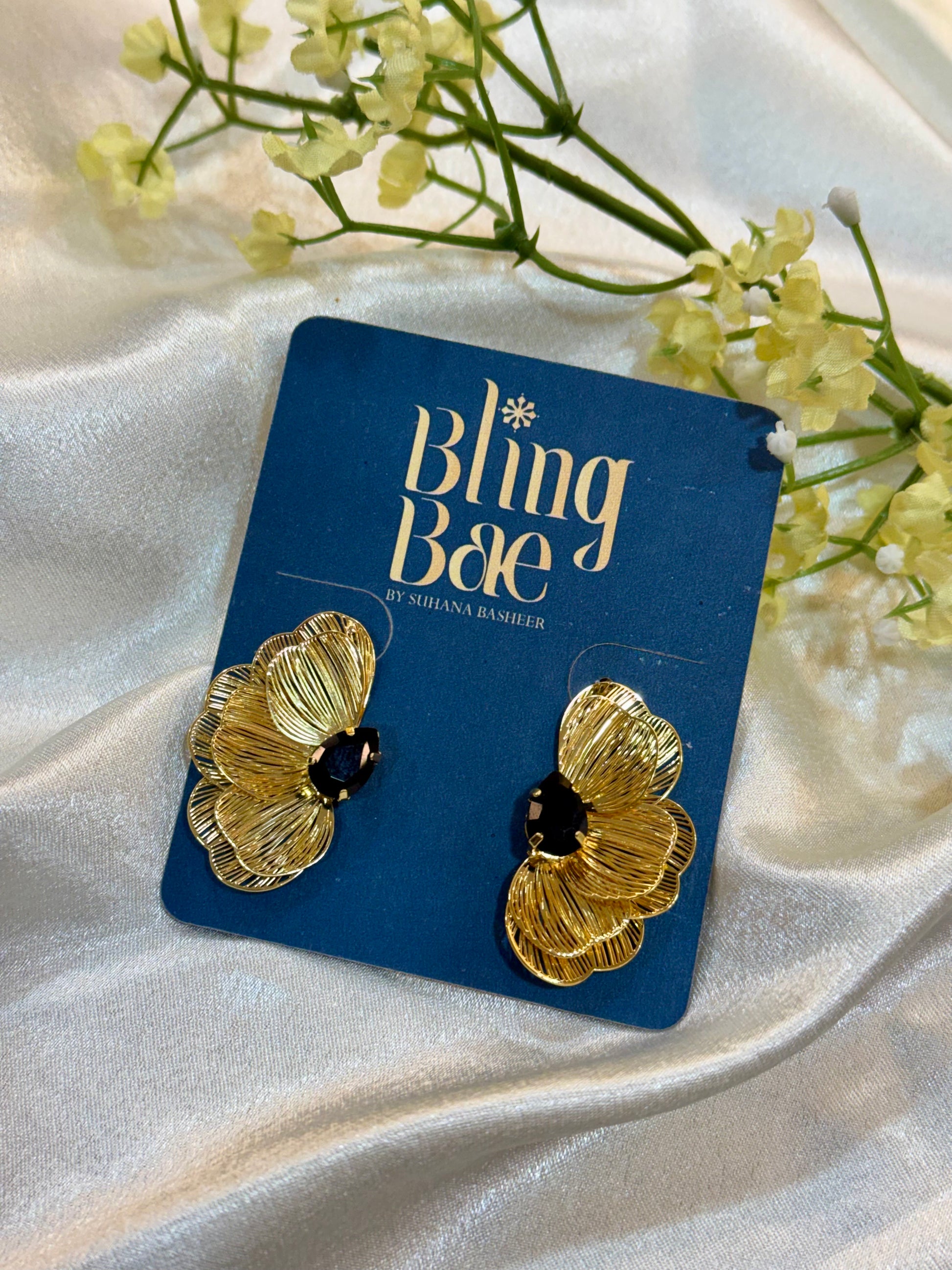 Gold Filigree Flower Stud With Black Stone